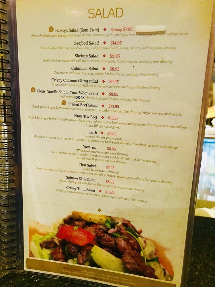 Choice of chicken, beef, or pork. Minced meat mixed with roasted rice powder, red onions, hot basil leaves, and spicy lime dressing served with cabbage. Spicy.