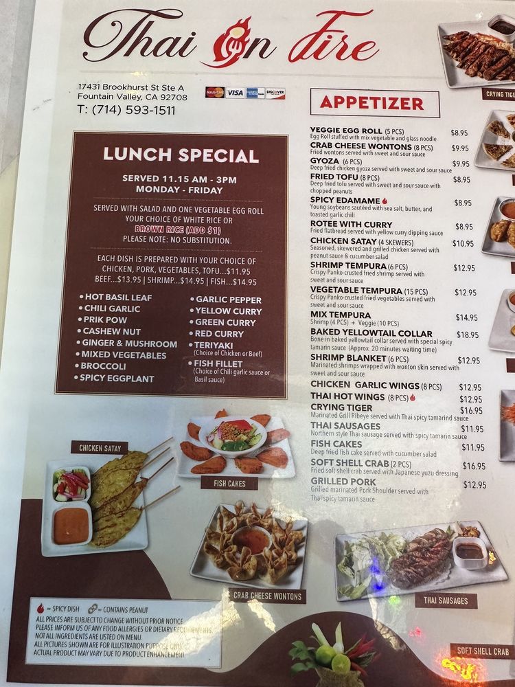 Welcome to Thai By Sushi On Fire, a culinary haven in Fountain Valley that artfully combines the vibrant flavors of Thai cuisine with a seafood twist. Their menu is a delightful exploration of taste, featuring appetizers like Crab Cheese Wontons and Crying Tiger Grilled Angus Beef that promise to tantalize your palate. The hearty Tom Yum Soup encapsulates the essence of Thailand with its zesty lemongrass and spicy notes, perfect for spice lovers.